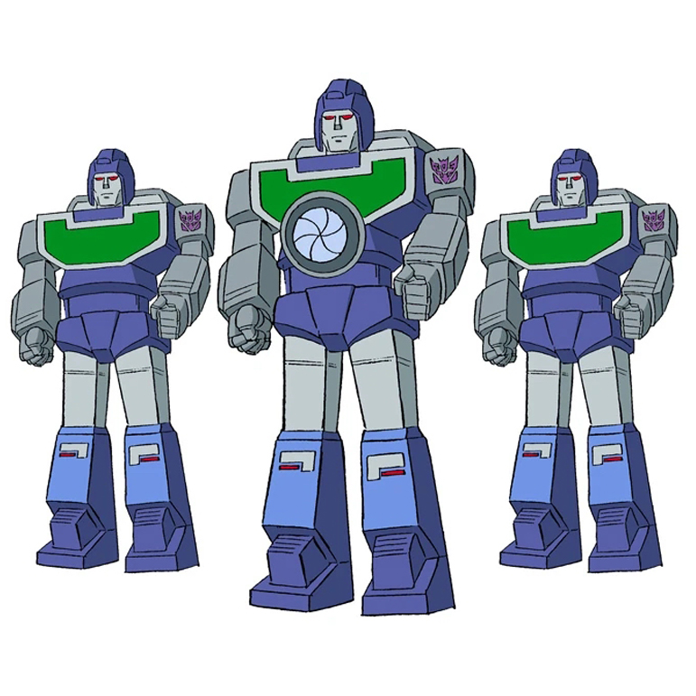 Reflector is a Decepticon who appears as a trio of identical robots that combine to form a single camera. Often used for espionage and surveillance, they serve as scouts who can record and transmit images back to Megatron. Though not strongly characterised as individuals, Reflector’s multiple bodies and stealth abilities make them versatile assets on covert missions. Their eerie uniformity and unusual transformation set them apart from the more prominent Decepticon warriors.